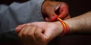 Purohit ties kalaavaa on yajmaan’s wrist to indicate that yajmaan has agreed to give daxinaa to purohit for purohit’s service.